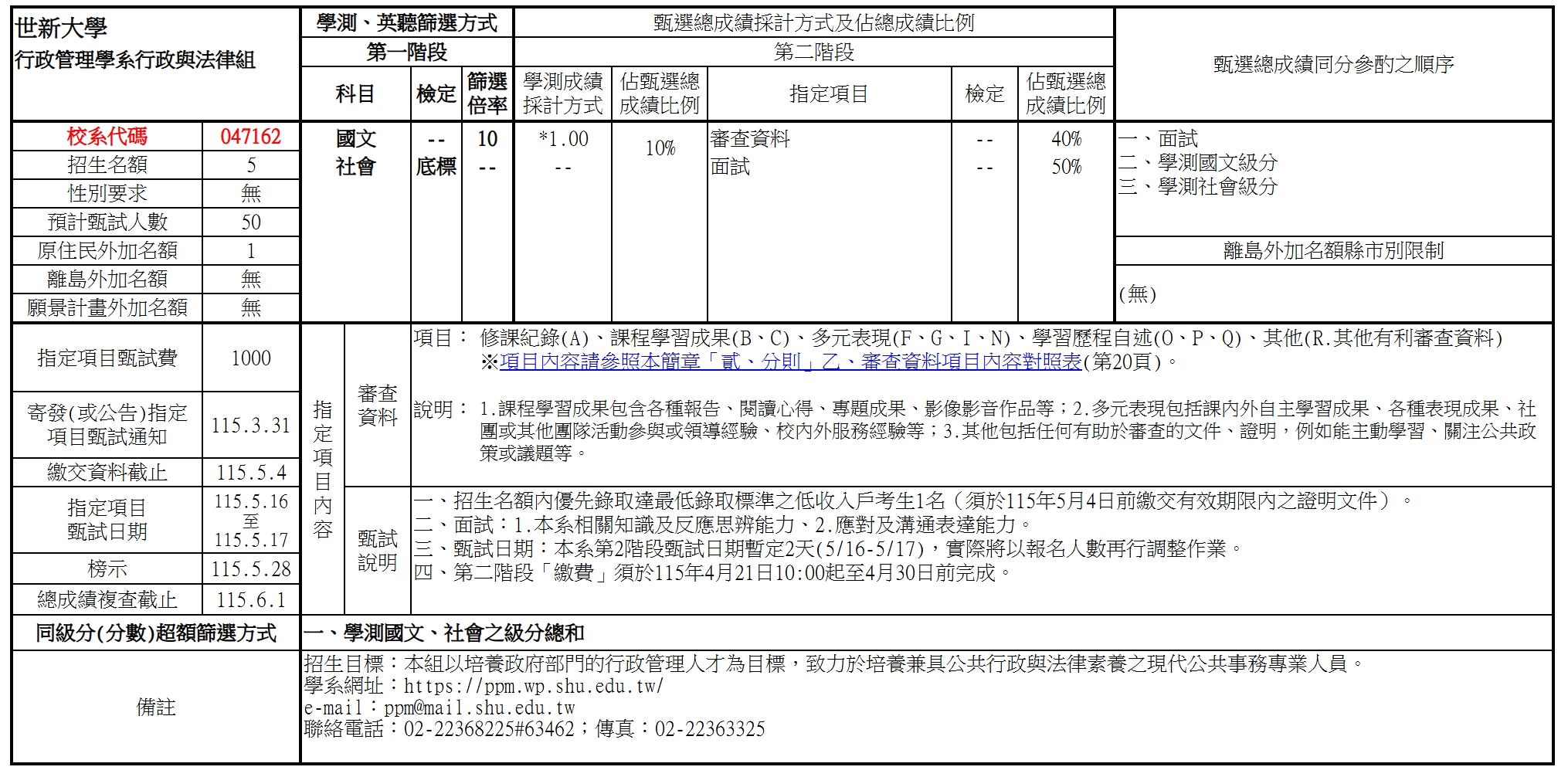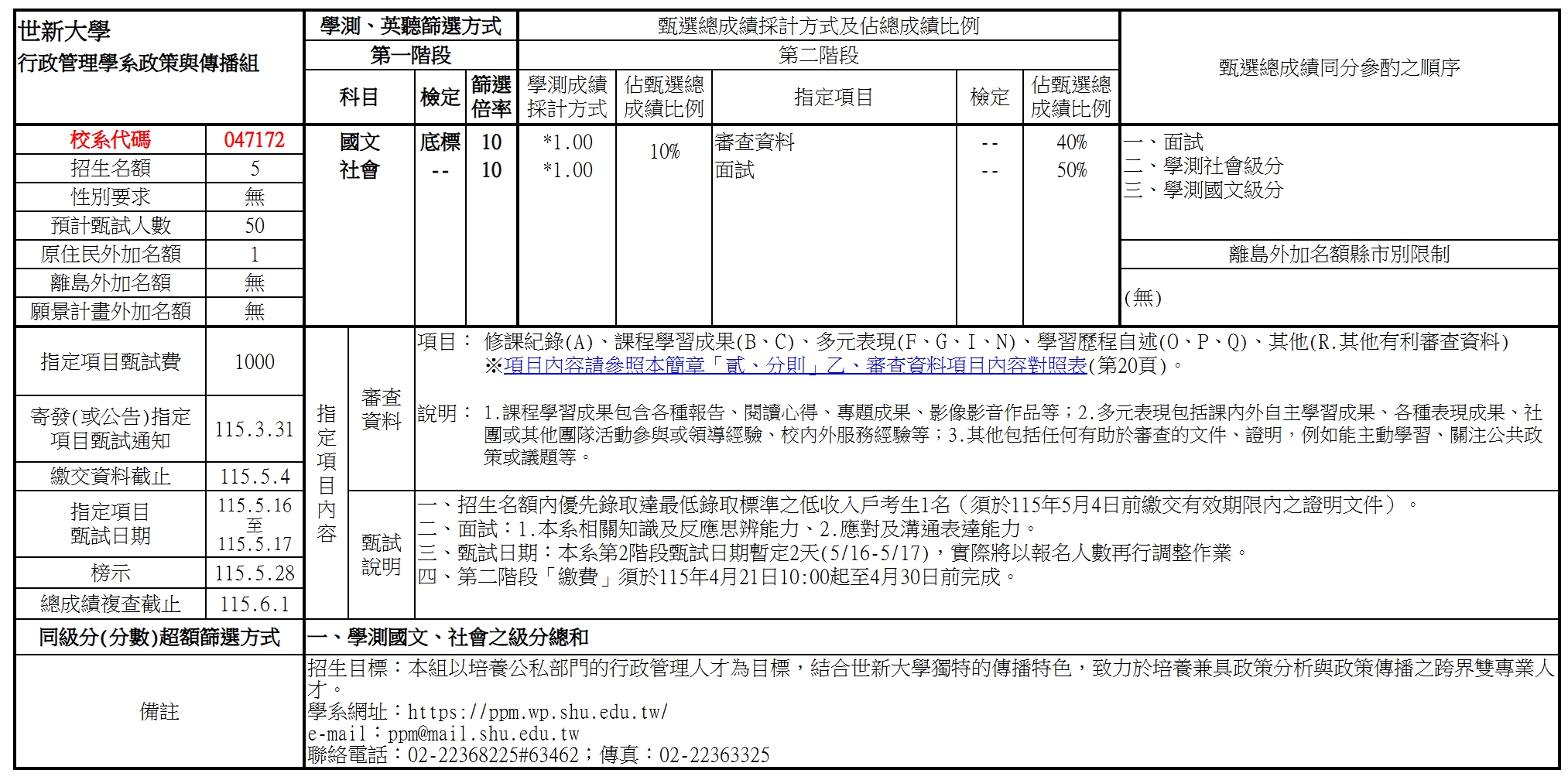115學年度大學申請入學招生重要事項說明(047世新大學)